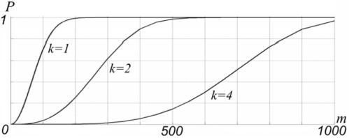 For example for the Ethernet MAC-addresses r - I is equal to 248. For 10-bit hash r=1024. Fig. 2 shows dependence of the collision probability from the number of nodes in net m of blocks k=l, k=2 and k=4. For this example the required amount of memory for lookup-table is 256Kbits.