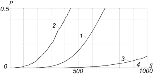 On the figure 4 s is a summary number of keys. Line 1,2 and 3 show dependence of collision probability for convenient method of hashing tables design like in previous example. Line 3, 4 and 5