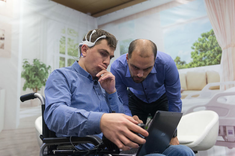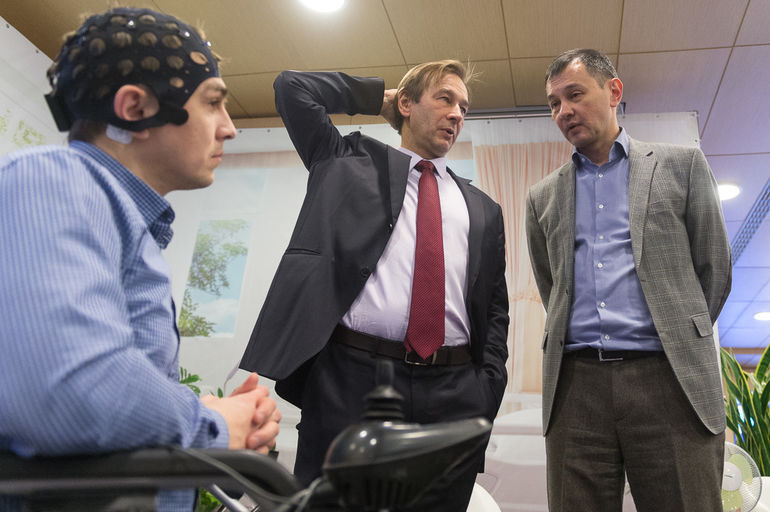 Здесь зеленоградская компания Neurobotics продемонстрировала, как с помощью датчиков, считывающих показания с коры головного мозга, можно управлять умным домом. Например, включать чайник или свет.