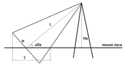 Из полученных формул видно, что необходимо искать компромисс между максимальным углом обзора (достигается при максимальном H и минимальном f) и максимальной протяженностью зоны контроля (наоборот, достигается при максимальном f). Также необходимо учитывать, что камера будет установлена под некоторым углом alfa к горизонту, зависящим от высоты вышки над уровнем леса (рис. 1).