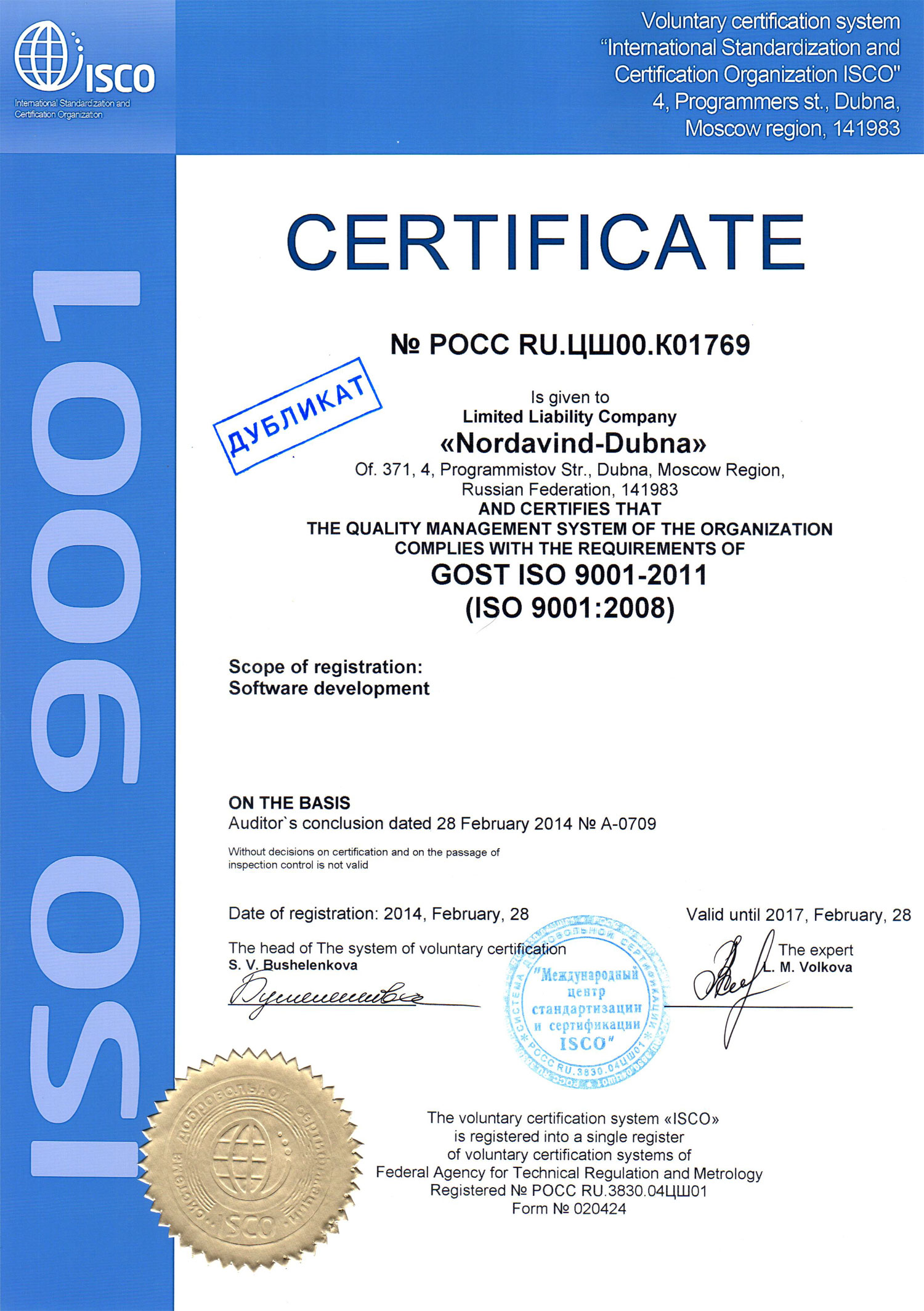 Международный сертификат соответствия ISO 9001:2008 в области разработки и производства программного обеспечения