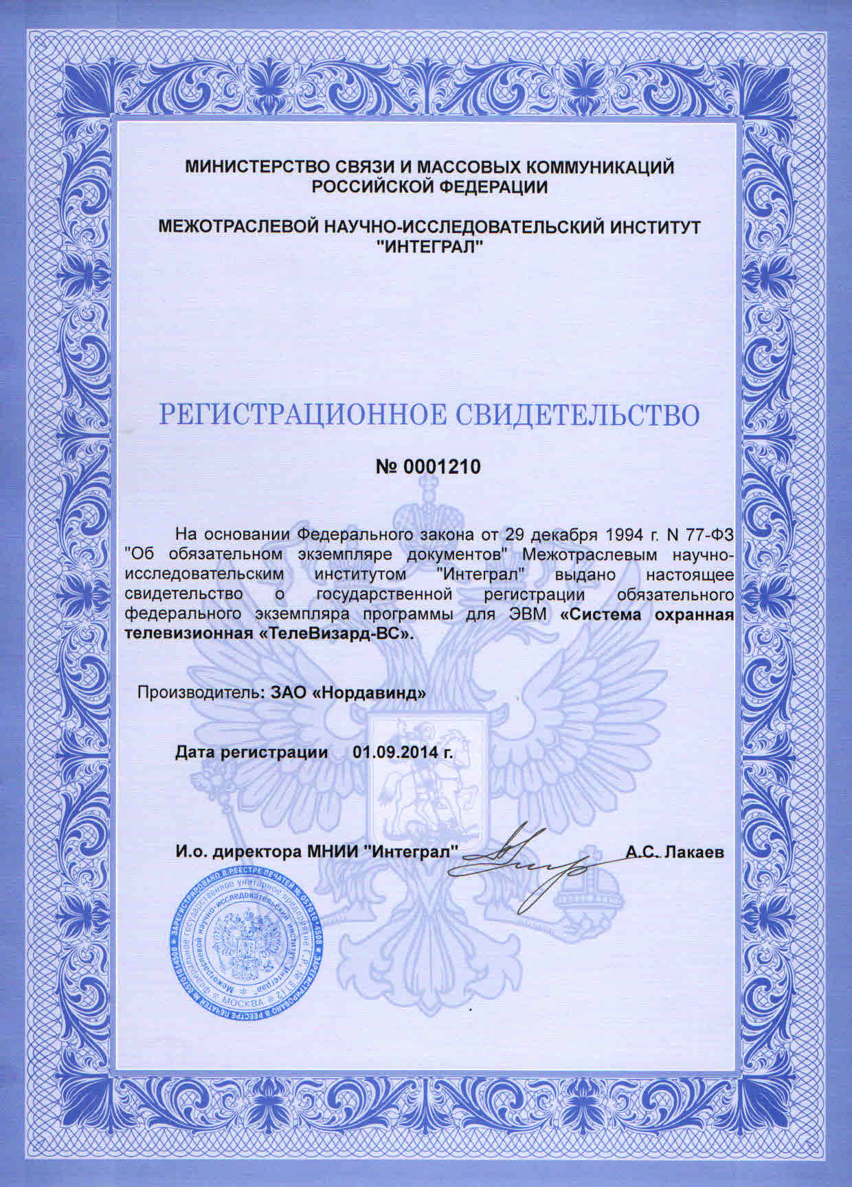 Регистрационное свидетельство №0001210 о государственной регистрации обязательного федерального экземпляра программы для ЭВМ «Система охранная телевизионная «ТелеВизард-ВС»