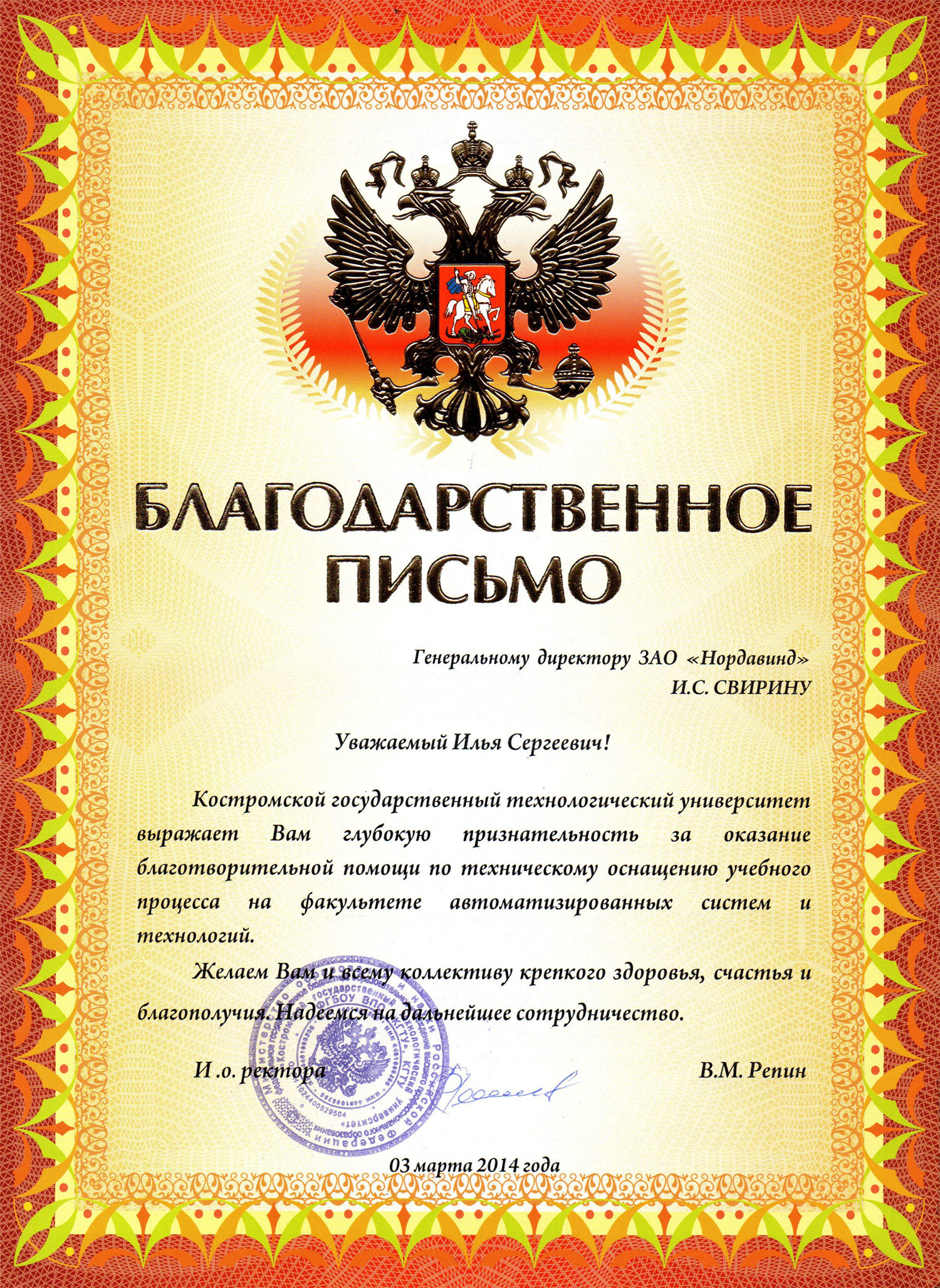 Костромской государственный технологический университет выражает вам глубокую признательность за оказание благотворительной помощи по техническому оснащению учебного процесса на факультете автоматизированных систем и технологий.