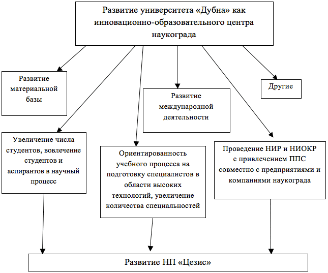 Рассмотрим конкретную стратегическую задачу наукограда «Развитие университета «Дубна» как инновационно-образовательного центра наукограда» (рис. 1), решение которой предполагает и развитие НП «Цезис» для дальнейшего моделирования взаимовлияния системы «Университет – Компания».
